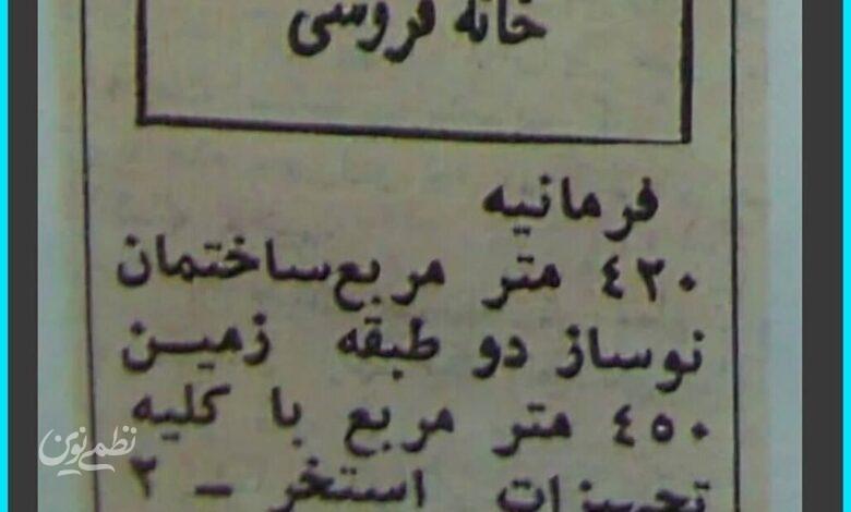 به گزارش همشهری آنلاین به نقل از فرادید، در حالی که در ماه‌های اخیر بازار مسکن تهران با افزایش بی‌سابقه قیمت‌ها روبه‌روست، آگهی فروش خانه‌ای ۴۲۰ متری در محله فرمانیه در سال ۱۳۵۶ با قیمت تنها ۲ میلیون تومان، در یکی از روزنامه‌های قدیمی توجهات را به خود جلب کرد.